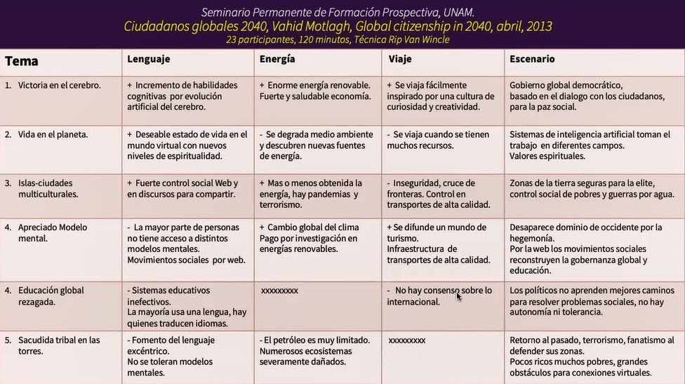 El siguiente cuadro resume la definición de ciudadanos globales en el año 2040 por Vahid Motlagh; la obtuvo aplicando a 23 participantes, en 120 minutos, la técnica Rip Van Winlke.
